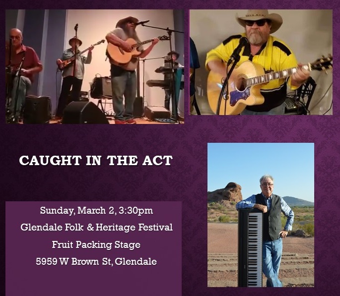 I’ll be playing keyboards with Bill Francis and Caught in the Act at the Glendale Folk & Heritage Festival, Saturday, March 2 at about 3:30pm on the Fruit Packing Stage. Hundreds of performers will be there for the two day festival.