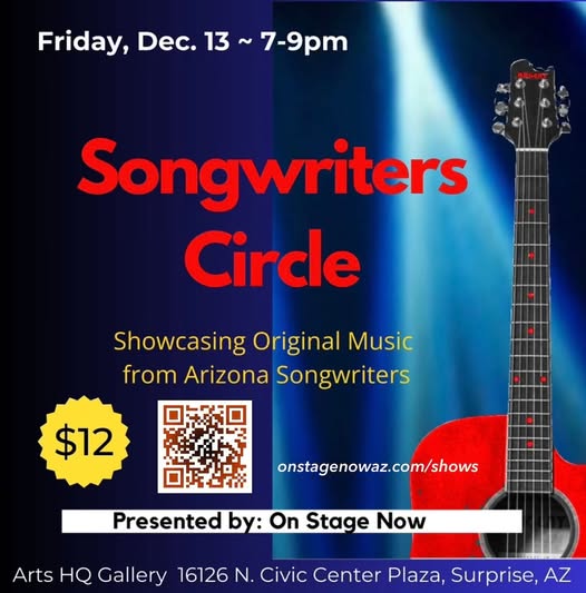However, I’ve been invited with a few other artists to play our originals at the On Stage Now Songwriters Circle on December 13 from 7-9pm in Surprise, AZ. Purchase tickets via the link below. Or you can see me to get tickets at $2 off.