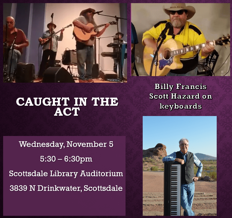 First up – I’ll be playing keyboards for Caught in the Act with Billy Francis. I’ve played with them before at the Glendale Auditorium and the Glendale Folk Festival. This time we’re at the Scottdale Library Auditorium this Wednesday, Nov. 5 at 5:30pm. Join us for an evening of Southern Country Rock and Blues.