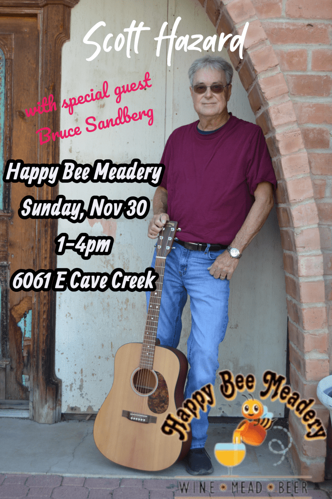 Today, I’m at the Happy Bee Meadery in Cave Creek with my special guest, Bruce Sandberg. Come on out an enjoy the outdoor patio and some Mead, Wine & Beer. And me!! 1-4pm.